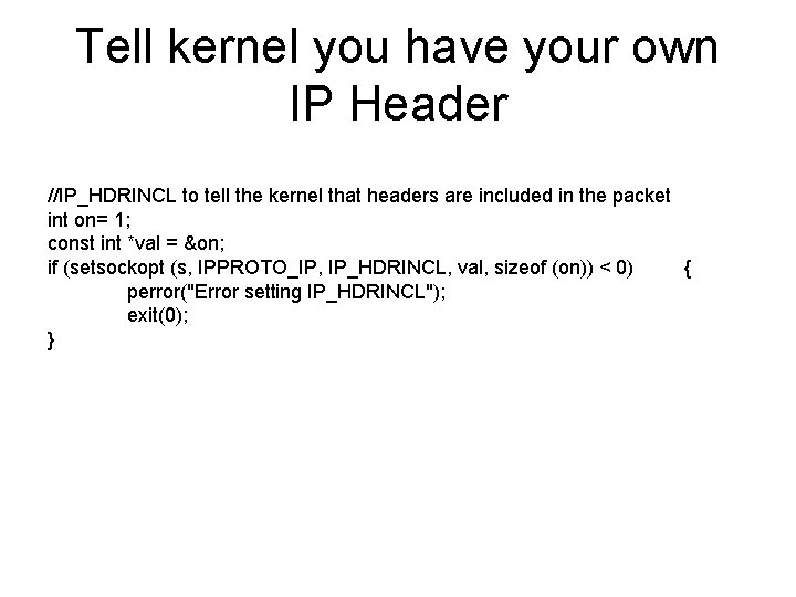 Tell kernel you have your own IP Header //IP_HDRINCL to tell the kernel that headers are included in the packet int on= 1; const int *val = &on; if (setsockopt (s, IPPROTO_IP, IP_HDRINCL, val, sizeof (on)) < 0) { perror("Error setting IP_HDRINCL"); exit(0); }