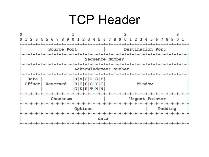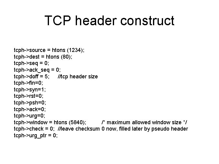 TCP header construct tcph->source = htons (1234); tcph->dest = htons (80); tcph->seq = 0; tcph->ack_seq = 0; tcph->doff = 5; //tcp header size tcph->fin=0; tcph->syn=1; tcph->rst=0; tcph->psh=0; tcph->ack=0; tcph->urg=0; tcph->window = htons (5840); /* maximum allowed window size */ tcph->check = 0; //leave checksum 0 now, filled later by pseudo header tcph->urg_ptr = 0;