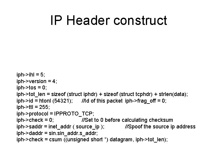 IP Header construct iph->ihl = 5; iph->version = 4; iph->tos = 0; iph->tot_len = sizeof (struct iphdr) + sizeof (struct tcphdr) + strlen(data); iph->id = htonl (54321); //Id of this packet iph->frag_off = 0; iph->ttl = 255; iph->protocol = IPPROTO_TCP; iph->check = 0; //Set to 0 before calculating checksum iph->saddr = inet_addr ( source_ip ); //Spoof the source ip address iph->daddr = sin_addr. s_addr; iph->check = csum ((unsigned short *) datagram, iph->tot_len);