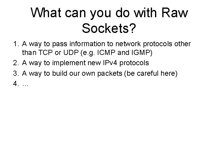 What can you do with Raw Sockets? 1. A way to pass information to network protocols other than TCP or UDP (e. g. ICMP and IGMP) 2. A way to implement new IPv 4 protocols 3. A way to build our own packets (be careful here) 4. …