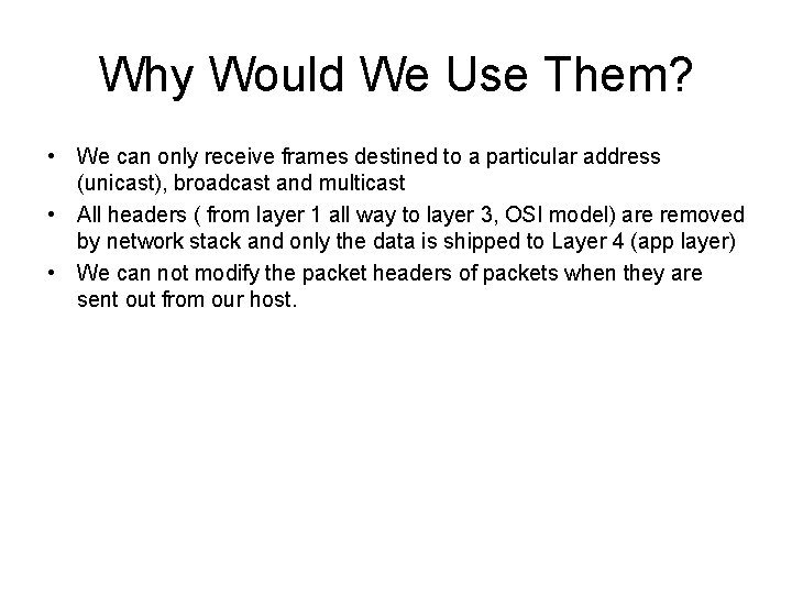 Why Would We Use Them? • We can only receive frames destined to a particular address (unicast), broadcast and multicast • All headers ( from layer 1 all way to layer 3, OSI model) are removed by network stack and only the data is shipped to Layer 4 (app layer) • We can not modify the packet headers of packets when they are sent out from our host.