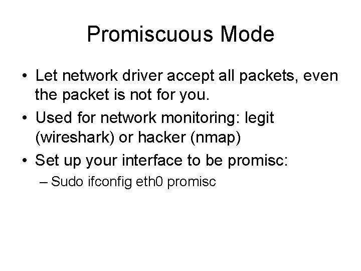 Promiscuous Mode • Let network driver accept all packets, even the packet is not for you. • Used for network monitoring: legit (wireshark) or hacker (nmap) • Set up your interface to be promisc: – Sudo ifconfig eth 0 promisc