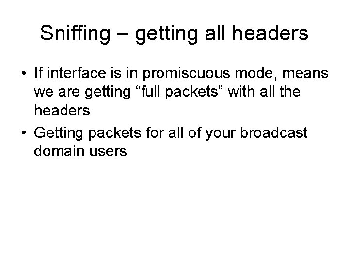 Sniffing – getting all headers • If interface is in promiscuous mode, means we are getting “full packets” with all the headers • Getting packets for all of your broadcast domain users