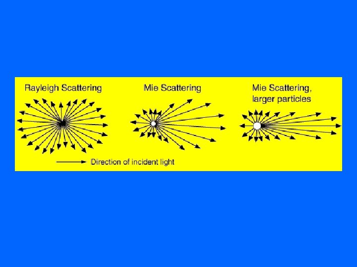Mie Scattering The scattering from molecules and very tiny particles (< 1 /10 wavelength) is predominantly Rayleigh scattering. For particle sizes larger than a wavelength, Mie scattering predominates. This scattering produces a pattern like an antenna lobe, with a sharper and more intense forward lobe for larger particles.
