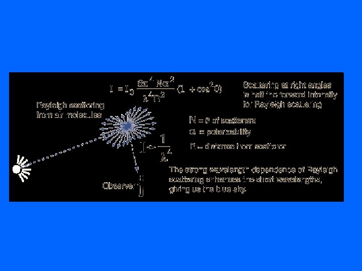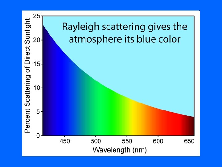 Rayleigh Scattering Rayleigh scattering refers to the scattering of light off of the molecules of the air, and can be extended to scattering from particles up to about a tenth of the wavelength of the light. It is Rayleigh scattering off the molecules of the air which gives us the blue sky. Lord Rayleigh calculated the scattered intensity from dipole scatterers much smaller than the wavelength to be: