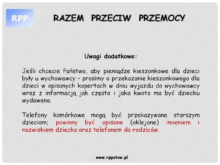 RAZEM PRZECIW PRZEMOCY Rzeczy, których lepiej nie zabierać na kolonie, ponieważ organizator nie ponosi za nie odpowiedzialności: -zbyt dużej ilości gotówki -urządzeń elektronicznych ( odtwarzacze mp 3, mp 4, telefony komórkowe, gry elektroniczne itp. ) -drogiej biżuterii i zegarków -leków ( bez konsultacji z lekarzem), a o konieczności zażywania ich proszę poinformować wychowawców lub kierownika www. rppstow. pl
