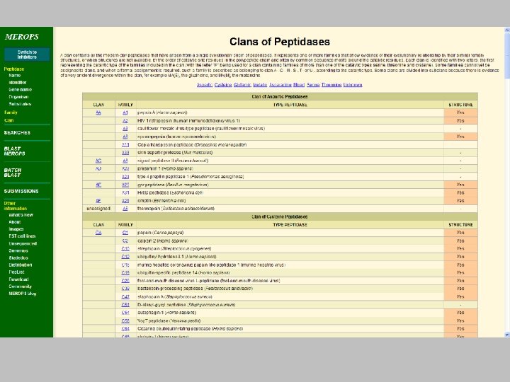 Razgradnja proteinov (proteoliza) • • • razgradnja v prebavilih razgradnja v celici in vitro Proteolitični encimi (proteinaze) • Sistematika na osnovi mehanizma (oz. AK v aktivnem centru): serinske, cisteinske (tiolne), aspartatne, glutamatne, treoninske, metalo~, mešanega tipa, z neznanim mehanizmom • Klasifikacija MEROPS: razdelitev na klane in družine glede na mehanizem in evolucijsko sorodnost