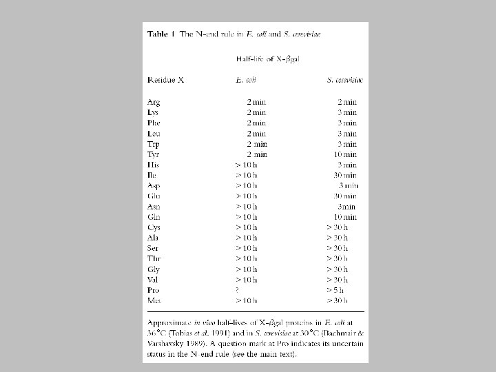 Pravilo N-konca Razen osnovnih destabilizirajočih N-končnih aminokislinskih ostankov oz. zaporedja (N-degron) obstajajo še dodatni signali, ki vplivajo na obstojnost proteina po pretvorbah: Asn, Gln – terciarna destabilizirajoča ostanka – se encimsko deaminirata v sekundarna destabilizirajoča Asp in Glu. Nanju se veže (primarno destabilizirajoči) Arg ob delovanju Arg-t. RNA-transferaze. S. cerevisiae PNAS (2009)