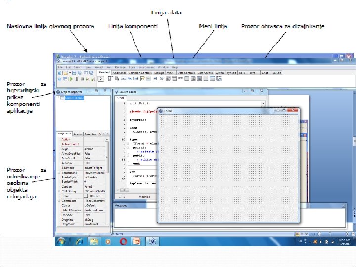 2. Radno okruženje je podeljeno na tri celine. Gornji prozor se može uzeti kao glavni prozor. On sadrži trake za alate (toolbars) i paletu komponenti (component palette). Traka za alate Vam omogućava da jednim klikom miša pokrenete poslove kao što je otvaranje, snimanje i prevođenje projekta. Paleta komponenti sadrži širok spektar komponenti koje možete ubaciti u forme (komponente su tekst natpisi, kontrole za editovanje, list boksovi, dugmad i slično). Radi udobnosti komponente su podeljene u grupe. Da biste postavili komponentu na Vašu formu jednostavno kliknite na dugme komponente u okviru palete komponenti a zatim kliknite na mesto u okviru forme gde biste želeli da se pojavi Vaša komponenta.