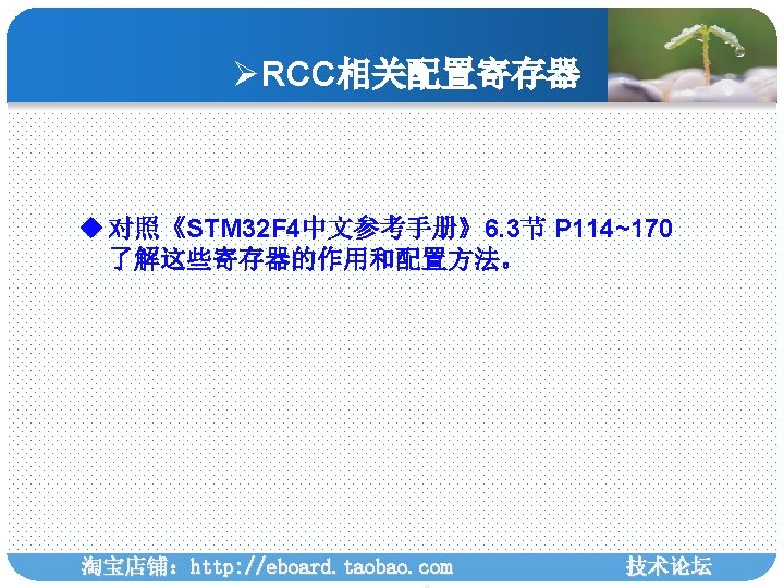 ØRCC相关配置寄存器 typedef struct { __IO uint 32_t CR; __IO uint 32_t PLLCFGR; __IO uint 32_t CFGR; /*!< RCC clock configuration register, Address offset: 0 x 08 */ __IO uint 32_t CIR; /*!< RCC clock interrupt register, Address offset: 0 x 0 C */ __IO uint 32_t AHB 1 RSTR; /*!< RCC AHB 1 peripheral reset register, Address offset: 0 x 10 */ __IO uint 32_t AHB 2 RSTR; /*!< RCC AHB 2 peripheral reset register, Address offset: 0 x 14 */ __IO uint 32_t AHB 3 RSTR; /*!< RCC AHB 3 peripheral reset register, Address offset: 0 x 18 */ uint 32_t RESERVED 0; /*!< Reserved, 0 x 1 C */ __IO uint 32_t APB 1 RSTR; /*!< RCC APB 1 peripheral reset register, Address offset: 0 x 20 */ __IO uint 32_t APB 2 RSTR; /*!< RCC APB 2 peripheral reset register, Address offset: 0 x 24 */ uint 32_t RESERVED 1[2]; /*!< Reserved, 0 x 28 -0 x 2 C */ __IO uint 32_t AHB 1 ENR; /*!< RCC AHB 1 peripheral clock register, Address offset: 0 x 30 */ __IO uint 32_t AHB 2 ENR; /*!< RCC AHB 2 peripheral clock register, Address offset: 0 x 34 */ __IO uint 32_t AHB 3 ENR; /*!< RCC AHB 3 peripheral clock register, Address offset: 0 x 38 */ uint 32_t RESERVED 2; /*!< Reserved, 0 x 3 C */ __IO uint 32_t APB 1 ENR; /*!< RCC APB 1 peripheral clock enable register, Address offset: 0 x 40 */ __IO uint 32_t APB 2 ENR; /*!< RCC APB 2 peripheral clock enable register, Address offset: 0 x 44 */ uint 32_t RESERVED 3[2]; /*!< Reserved, 0 x 48 -0 x 4 C */ __IO uint 32_t AHB 1 LPENR; /*!< RCC AHB 1 peripheral clock enable in low power mode register, Address offset: 0 x 50 */ __IO uint 32_t AHB 2 LPENR; /*!< RCC AHB 2 peripheral clock enable in low power mode register, Address offset: 0 x 54 */ __IO uint 32_t AHB 3 LPENR; /*!< RCC AHB 3 peripheral clock enable in low power mode register, Address offset: 0 x 58 */ uint 32_t RESERVED 4; /*!< Reserved, 0 x 5 C */ __IO uint 32_t APB 1 LPENR; /*!< RCC APB 1 peripheral clock enable in low power mode register, Address offset: 0 x 60 */ __IO uint 32_t APB 2 LPENR; /*!< RCC APB 2 peripheral clock enable in low power mode register, Address offset: 0 x 64 */ uint 32_t RESERVED 5[2]; __IO uint 32_t BDCR; __IO uint 32_t CSR; uint 32_t RESERVED 6[2]; __IO uint 32_t SSCGR; __IO uint 32_t PLLI 2 SCFGR; __IO uint 32_t PLLSAICFGR; __IO uint 32_t DCKCFGR; } RCC_Type. Def; 淘宝店铺:http: //eboard. taobao. com 技术论坛