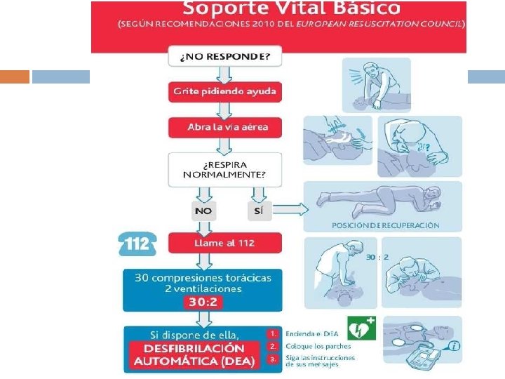 PRINCIPALES CAMBIOS EN SVB (CON GUÍAS DE 2005) Los teleoperadores de emergencias Importancia de boqueadas o “gasping” como signo de parada cardíaca. Aplicar compresiones torácicas de alta calidad: Profundidad de al menos 5 cm 100 compresiones/min Permitir el retroceso completo del tórax Reducir al máximo las interrupciones de las compresiones torácicas. Los reanimadores Entrenados: ventilaciones con relación 30: 2. No entrenados: RCP sólo compresiones torácicas guiada por teléfono. Uso de dispositivos con mensajes interactivos durante la RCP