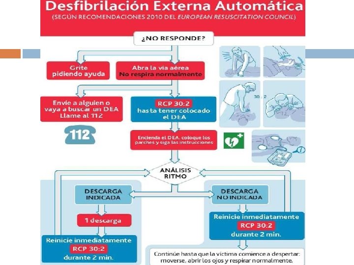 DESFIBRILACIÓN DESA EL ÚNICO TRATAMIENTO EFICAZ PARA REVERTIR UNA FV ES UNA DESFIBRILACIÓN PRECOZ. La FV evoluciona en muy pocos minutos a la asistolia. Revierte en un 90% si la desfibrilación se realiza en el 1º min. , ↓ eficacia en un 10% por cada min. de retraso en su ejecución; después de 12 min. la supervivencia ↓ 2%-5%. La desfibrilación se aplicará después de realizar el SVB. Aplicar DESA tras comprobar que la víctima “NO RESPONDE y NO RESPIRA”