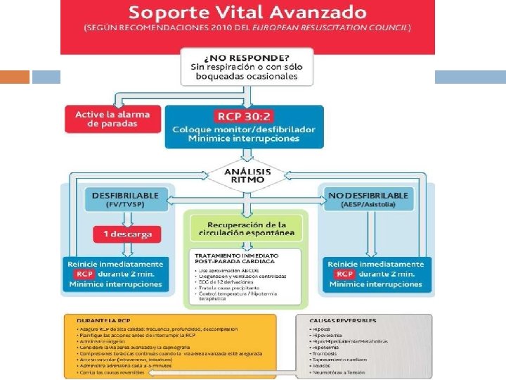 RITMOS DESFIBRILABLES 1º descarga: 360 J monofásica. 150 -200 J bifásica Reanudar Si persiste FV o TVSP: 2º descarga Reanudar RCP 2 min. y comprobar después pulso Si persiste: 3º descarga Reanudar compresiones torácicas +: 1 mg adrenalina ev 300 mg amiodarona Si persiste: cada 2 min. de RCP analizar ritmo +: Adrenalina 1 mg cada 3 -5 min (cada 2 ciclos)