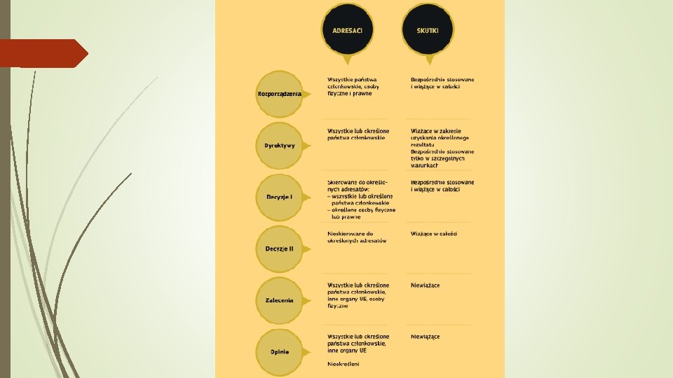 Dyrektywa Służy harmonizacji (zbliżaniu) prawa w państwach członkowskich. Skierowana do państw członkowskich; wiąże tylko państwa (prawa i obowiązki) Określa cel, który ma zostać osiągnięty, państwa członkowskie mają swobodę wyboru formy i środków osiągnięcia tego celu dyrektywa wymaga transpozycji (implementacji) do prawa krajowego (terminowa transpozycja to obowiązek państwa, ma charakter bezwzględny, państwa nie mogą się od niego uchylić, zakres swobody pozostawionej państwu bywa zróżnicowany, w zależności od konkretnej dyrektywy (szczegółowe, czy tylko minimalne lub ramy regulacji) wszystkie organy krajowe mają obowiązek zapewnienia pełnej skuteczności dyrektywie. Jeśli dyrektywa zostaje prawidłowo implementowana, stosuje się prawo krajowe przyjęte w tym celu. Jeśli implementacja nie została przeprowadzona prawidłowo istnieje możliwość powołania się na samą dyrektywę (skutek bezpośredni, odpowiedzialność odszkodowawcza).