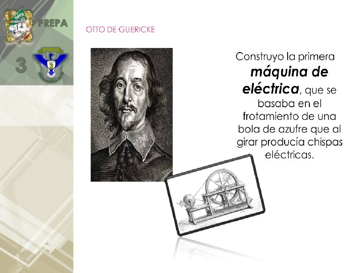 PIETER VAN MUSSCHENBROEK: Descubrió la manera de almacenar cargas eléctricas (botella Leyden). 1656 electroimán. CHARLES COULOMB: Invento la balanza de torsión (para medir fuerza de atracción y de repulsión). TALES DE MILETO: frotar el ámbar con piel de gato, atrae cuerpos ligeros. 600 a. C JOSEPH HENRY: Constructor del primer 1746 1753 OTTO DE GUERICKE Construyo la primera máquina de eléctrica 1777 1775 ALESSANDRO VOLTA: Invento el electróforo. BENJAMIN FRANKLIN: Observo que cuando un conductor negativo termina en punta , los electrones se acumulan en el mismo. 1825 1827 GEORG OHM: Estableció la ley fundamental de las corrientes eléctricas.