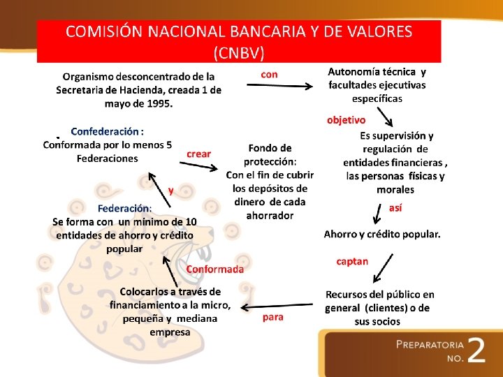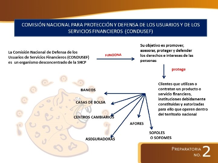 SISTEMA FINANCIERO MEXICANO La autoridad máxima es la Secretaría de Hacienda y Crédito Público Con base en el artículo 31 de la Ley Orgánica de la Administración Pública Federal Organismos Reguladores Comisión Nacional Bancaria y de Valores (CNBV) Banco de México (BANXICO) Comisión Nacional de Seguros y Fianzas (CNSF) Comisión Nacional para protección y Defensa de los Usuarios y de los Servicios Financieros ( CONDUSEF) Funciones: V Manejar la deuda pública de la Federación y el Distrito Federal VI Realizar o autorizar todas la operaciones en que se haga uso del crédito público VII Planear, coordinar, evaluar y vigilar el sistema bancario del país Instituto para la Protección del Ahorro Bancario (IPAB) Comisión Nacional del Sistema de Ahorro para el Retiro (CONSAR)
