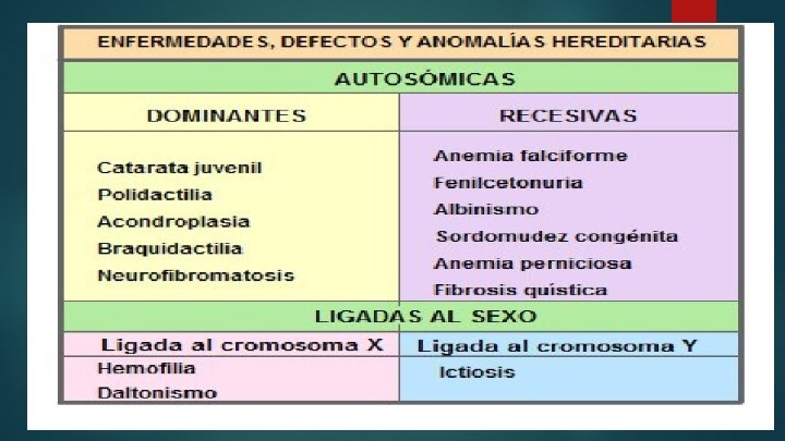Daltonismo. Consiste en la incapacidad de distinguir determinados colores, especialmente el rojo y el verde. Es un carácter regulado por un gen recesivo localizado en el segmento diferencial del cromosoma X.