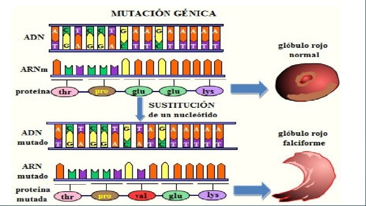 representa una mutación génica. En la parte superior está representado un trozo de la cadena de ADN normal, que lleva la información para que se fabrique una proteína, en este caso una proteína llamada hemoglobina que se encuentra en los glóbulos rojos y que sirve para transportar el oxígeno. Vemos que se sintetiza la proteína buena y los glóbulos rojos son normales. En la parte inferior del dibujo está representada una mutación génica. Observa que hay un pequeño cambio en los nucleótidos del ADN, hay una TIMINA en lugar de ADENINA. Esta simple variación hace que la molécula de ARNm será distinto y cuando se traduzca el mensaje se incorpore un aminoácido distinto, y en lugar de GLUTÁMICO se un aminoácido que es la VALINA. Este pequeño cambio hace que sea una proteína distinta y en este caso además da origen a una proteína defectuosa que transporta mal el oxígeno. Las personas que llevan este alelo mutado padecen una enfermedad conocida como anemia
