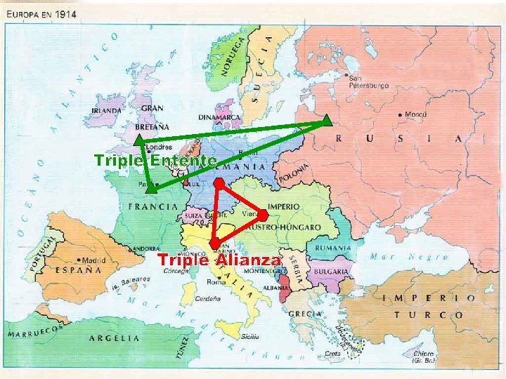 CAUSA DIRECTA DE LA GUERRA MUERTE DEL Archiduque Francisco Fernando TRIPLE ENTENTE: Gran Bretaña Francia Rusia detonante TRIPLE ALIANZA Alemania Austria-Hungría Italia ULTIMÁTUM A SERBIA Se declara la Guerra, reacción en cadena de las naciones europeas.