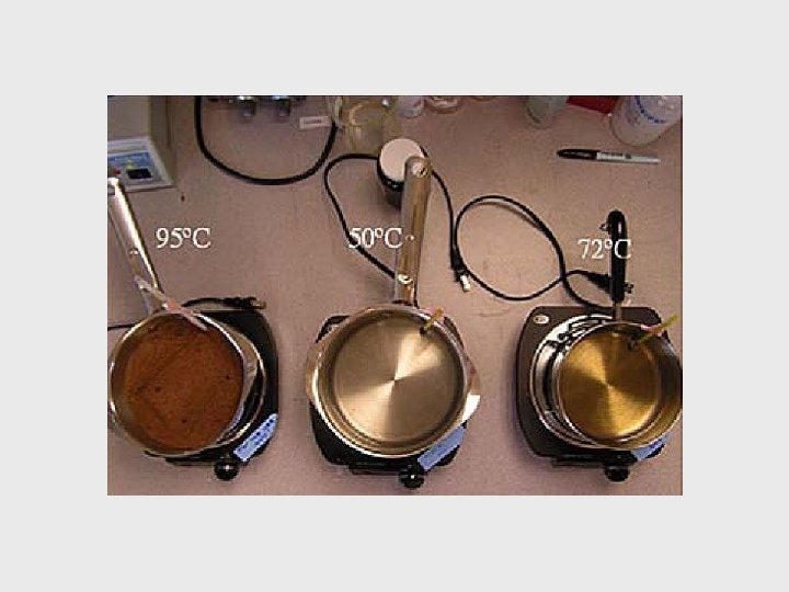 • Termociclador • Reacción comienza a 94ºC: puentes de H que mantienen unidos a la doble hebra se rompen ADN molde se desnaturaliza (moléculas simple cadena) • La temperatura es reducida a 50 -60ºC: primers se hibridan en sus posiciones de pegado (annealing). • Síntesis de ADN (expansión): a 72ºC (temperatura óptima para Taq pol) • Primeros ciclos: grupo de productos largos se sintetiza a partir de cada cadena de ADN molde. Estos polinucleótidos tienen extremos 5´ idénticos pero extremos 3´ distintos.