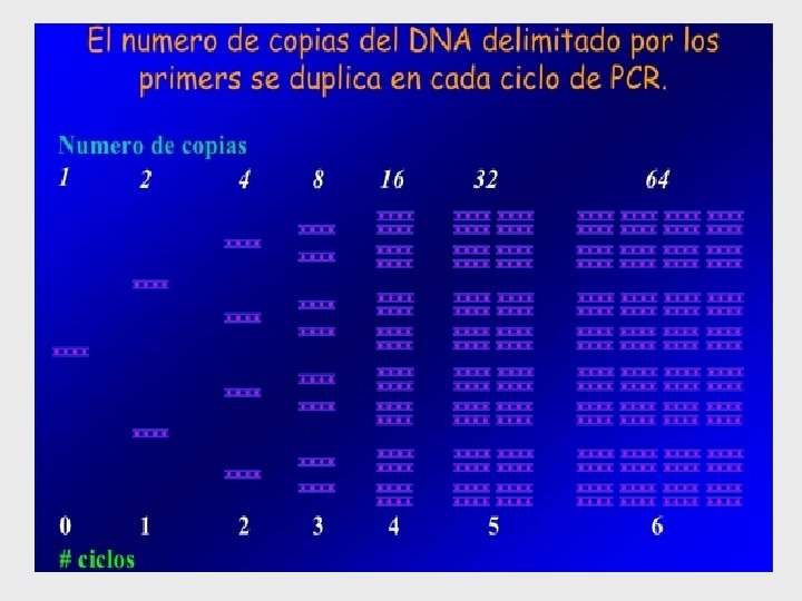 • Ciclos desnaturalización – hibridación (annealing) expansión: productos largos actúan como molde para la síntesis de ADN dando productos cortos con extremos 5’ y 3’ determinados por los sitios de pegado de los primers. • Ciclos subsecuentes: productos cortos se acumulan (exponencialmente) hasta que uno de los componentes se agota.
