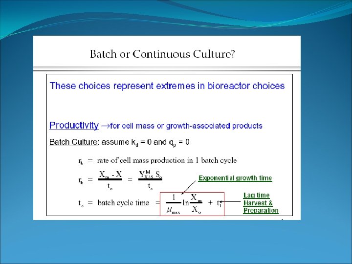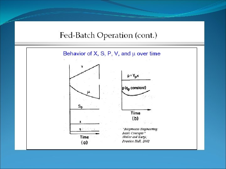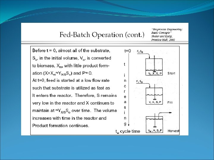 Fed batch §Substrate balance – no outflow (Fcout = 0), sterile feed §St = SV and Xt = XV (mass of substrate or cells in reactor at a given time) §S 0 = substrate in feed stream substrate in Substrate balance Cell balance substrate consumed no substrate out (Flow out = 0)