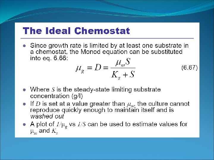 Cell Growth in Ideal Chemostat Determination of Monod Parameters In Chemostat: µg=D, varying D obtains D~S µm = 0. 2 hr-1 Washed out: If D is set at a value greater than µm (D > µm), the culture cannot reproduce quickly enough to maintain itself. Chemostat technique: reliable, constant environment, operation may be difficult.