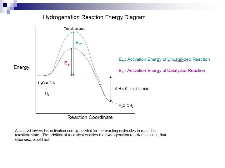 How a Catalyst Works n A catalyst works by lowering the activation energy (Ea) of a reaction so that a larger fraction of the reactants have sufficient energy to react. n It provides an alternative mechanism for the reaction.