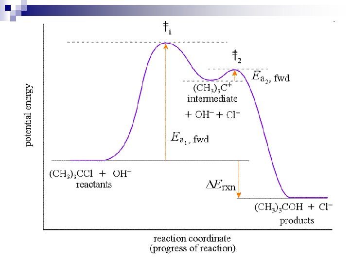 Example n (CH 3)3 CCl + OH- → (CH 3)3 COH + Cl- n Chemists have proposed the following twostep mechanism for the reaction. Each step is an elementary reaction. n Step 1 (CH 3)3 CCl + OH- →(CH 3)3 C+ + OH- + Cl- n Step 2 (CH 3)3 C+ + OH- + Cl- → (CH 3)3 COH + Cl-