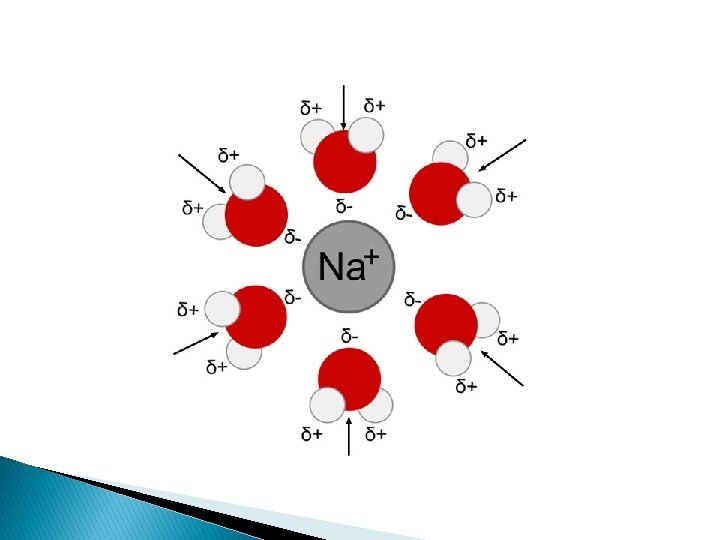 Here you see an example of how dipolar water molecules surround ions differently. Notice that on a positive ion, like Na, the negative part of the water combines with it. The opposite is true with chlorine.
