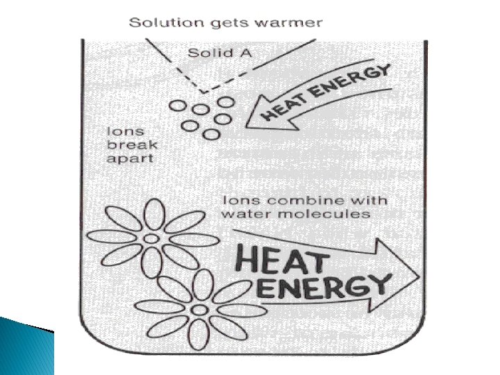 Dissolving Depending on the strength of the bond, the dissolving may use a lot or little energy. A strong bond will use a lot of heat energy and the temperature of the beaker will drop. As the ion recombines with water, energy is given back to the solution. If this energy is LESS than what was used to separate the compound, the overall net temperature will go down. The reverse will cause a temperature increase. (You can see these on slides 18 and 24).