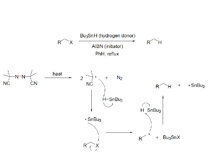 Reductions utilizing tributyltin hydride as a hydrogen atom donor The Sn-H bond is relatively weak (82 kcal/mole), relative to the C-H bond (99 kcal/mole) By contrast, tin forms stronger bonds to bromine, iodine, and sulfur than does carbon. C-S C-Br C-I C-H 65 kcal 68 kcal 51 kcal 99 kcal Sn-S Sn-Br Sn-I Sn-H 111 kcal 132 Kcal 56 kcal 82 kcal