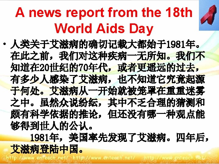 Fast-reading for general idea 1. What is this TV news special about? It gives some detailed information about Aids and how to fight the spread of Aids. 2. How many people around the world are infected with HIV every day? About 14, 000 people. 3. What places have been affected by Aids? Almost every country in the world has been affected by Aids.