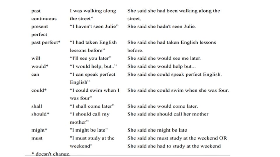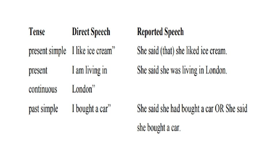 3. Direct and indirect (reported) speech • When do we use reported speech? Sometimes someone says a sentence, for example "I'm going to the cinema tonight". Later, maybe we want to tell someone else what the first person said. • We use a 'reporting verb' like 'say' or 'tell'. If this verb is in the present tense, it's easy. We just put 'she says' and then the sentence: Direct speech: I like ice cream. Reported speech: She says (that) she likes ice cream. • We don't need to change the tense, though probably we do need to change the 'person' from 'I' to 'she', for example. We also may need to change words like 'my' and 'your'.