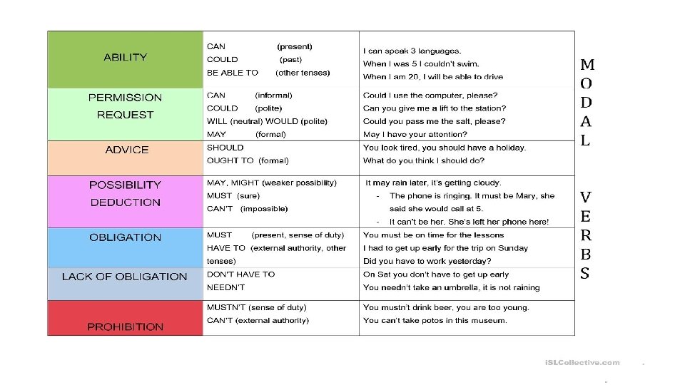 4. Auxiliary/Modal verbs • Auxiliary Verbs are the verbs be, do, have, will when they are followed by another verb (the full verb) in order to form a question, a negative sentence, a compound tense or the passive. • The modal verbs in are English: can, could, may, might, will/would, must, shall/should/ought to. • Modals are different from normal verbs: 1: They don't use an 's' for the third person singular. 2: They make questions by inversion ('she can go' becomes 'can she go? '). 3: They are followed directly by the infinitive of another verb (without 'to').