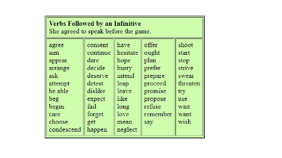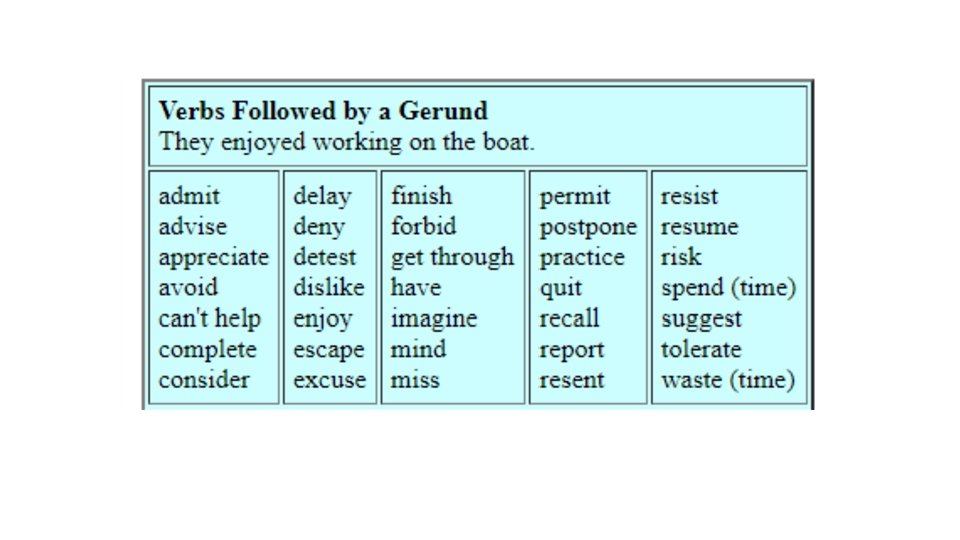 8. Verb patterns: gerund and infinitive We use gerunds (verb + ing): • After certain verbs - I enjoy singing • After prepositions - I drank a cup of coffee before leaving • As the subject or object of a sentence - Swimming is good exercise We use 'to' + infinitive: • After certain verbs - We decided to leave • After many adjectives - It's difficult to get up early We use the bare infinitive (the infinitive without 'to'): • After modal verbs - I can meet you at six o'clock • After 'let', 'make' and (sometimes) 'help' - The teacher lets us leave early. • After some verbs of perception (see, watch, hear, notice, feel, sense) - I watched her walk away • After expressions with 'why' - why go out the night before an exam?