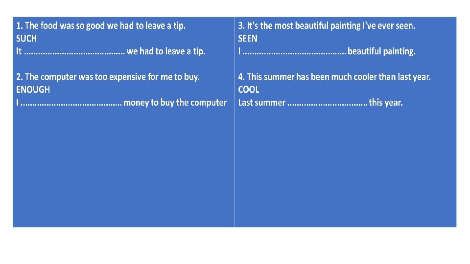 • In this part you will be given a complete sentence followed by a second, incomplete sentence. • You must complete the second sentence so that it has the same meaning as the first using a word given that must not be changed. There are 6 sentences in total. In the exam you transfer your answer to a special answer sheet. • Part 4 tests your knowledge of grammar and vocabulary. It is impossible to predict areas that you could be tested on here. However, the categories listed below appear quite often.