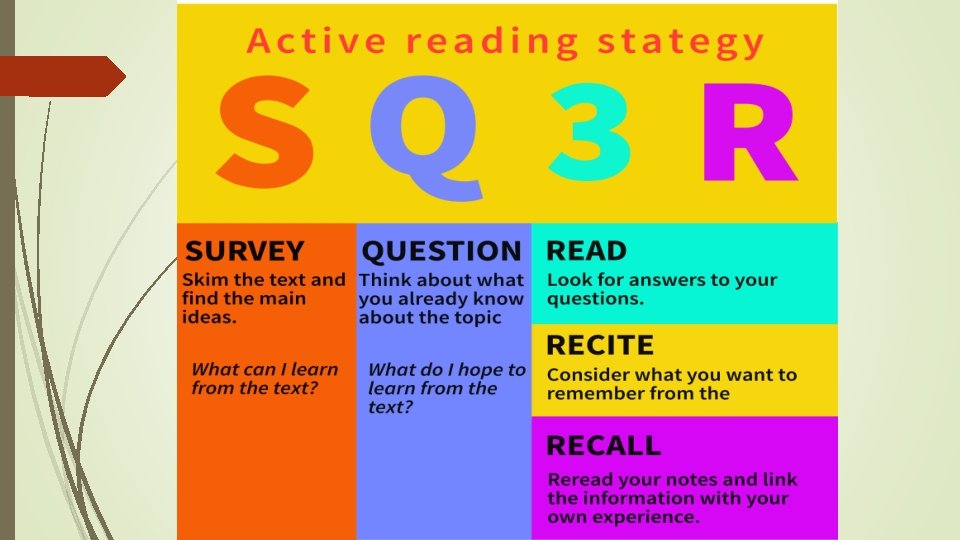 Reading to Learn and Retain Information Use the SQ 3 R approach Survey, Question, Read, Recite, Review. Why are you reading? Why is having a purpose important? What are clues your textbooks or readings give you to the structure of the reading? How can these help you? Table of contents, introduction, footnotes, glossary, bibliography, appendices, index
