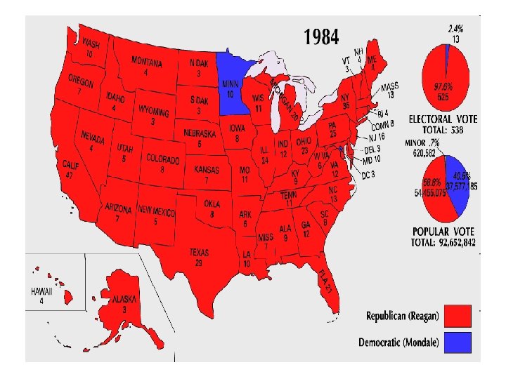 B. ) Election 1984 • Regan / Bush vs. Walter Mondale/ Geraldine Ferraro • (1 st woman major party Presidential Ticket) • Reagan won every state, but Minnesota.