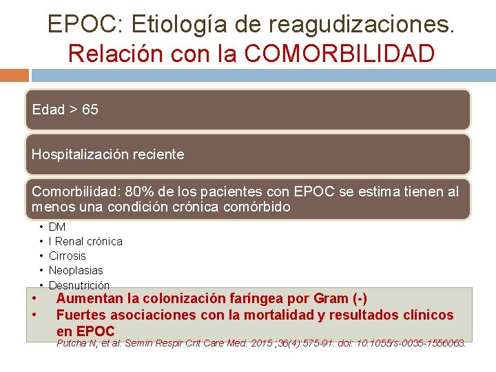EPOC: Etiología de reagudizaciones. EPOC: Relación con la COMORBILIDAD Edad > 65 Hospitalización reciente Comorbilidad: 80% de los pacientes con EPOC se estima tienen al menos una condición crónica comórbido • • DM I Renal crónica Cirrosis Neoplasias Desnutrición Aumentan la colonización faríngea por Gram (-) Fuertes asociaciones con la mortalidad y resultados clínicos en EPOC Putcha N, et al. Semin Respir Crit Care Med. 2015 ; 36(4): 575 -91. doi: 10. 1055/s-0035 -1556063.