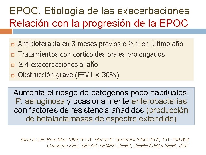 EPOC. Etiología de las exacerbaciones EPOC. Relación con la progresión de la EPOC Antibioterapia en 3 meses previos ó ≥ 4 en último año Tratamientos con corticoides orales prolongados ≥ 4 exacerbaciones al año Obstrucción grave (FEV 1 < 30%) Aumenta el riesgo de patógenos poco habituales: P. aeruginosa y ocasionalmenterobacterias P. aeruginosa enterobacterias con factores de resistencia añadidos (producción de betalactamasas de espectro extendido) Ewig S. Clin Pum Med 1999; 6: 1 -8. Monsó E. Epidemiol Infect 2003; 131: 799 -804. Consenso SEQ, SEPAR, SEMES, SEMG, SEMERGEN y SEMI. 2007