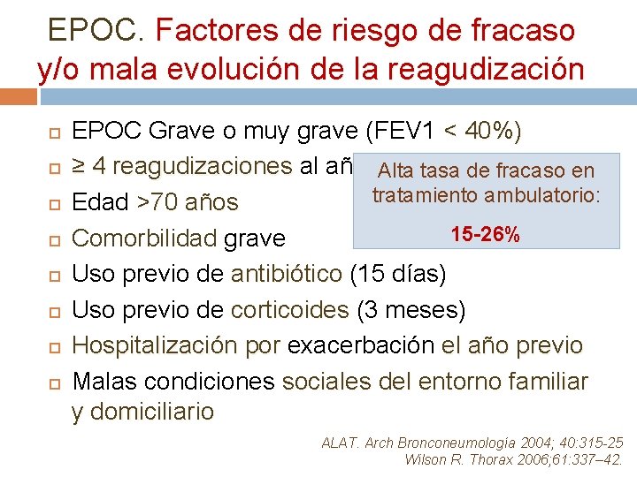 EPOC. Factores de riesgo de fracaso y/o mala evolución de la reagudización EPOC Grave o muy grave (FEV 1 < 40%) ≥ 4 reagudizaciones al año ≥ 4 reagudizaciones Alta tasa de fracaso en tratamiento ambulatorio: Edad >70 años 15 -26% Comorbilidad grave Uso previo de antibiótico (15 días) antibiótico Uso previo de corticoides (3 meses) corticoides Hospitalización por exacerbación el año previo Hospitalización por Malas condiciones sociales del entorno familiar y domiciliario ALAT. Arch Bronconeumología 2004; 40: 315 -25 Wilson R. Thorax 2006; 61: 337– 42.