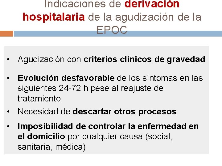 Indicaciones de derivación hospitalaria de la agudización de la EPOC • Agudización con criterios clínicos de gravedad • Evolución desfavorable de los síntomas en las siguientes 24 -72 h pese al reajuste de tratamiento • Necesidad de descartar otros procesos • Imposibilidad de controlar la enfermedad en el domicilio por cualquier causa (social, sanitaria, médica)