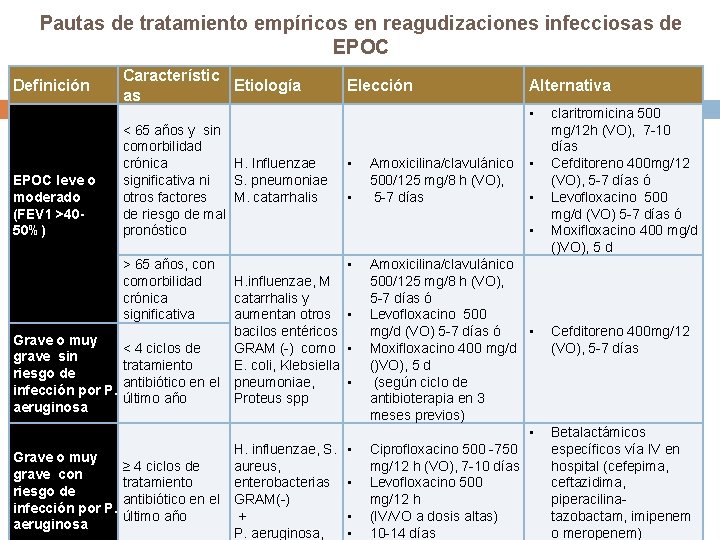 EPOC: Indicaciones del tratamiento antimicrobiano FR mala evolución/fracaso q q q q FEV 1 < 40% 4 reagudizaciones al año Edad >70 años Comorbilidad grave Corticoterapia previa (3 meses) Antibioterapia previa (15 días) Hospitalización por exacerbación el año previo q Malas condiciones sociales del entorno familiar y domiciliario Indicaciones de antibioterapia FEV 1: 60 -80%: 3 criterios de Anthonisen con/sin fiebre FEV 1: 40 -60%: 2 criterios* + fiebre en ausencia de otro foco ó algún factor de mal a evoluciòn FEV 1 < 40%: 1 criterio de Anthonisen* ó cualquier otro + Fiebreen ausencia de otro foco algún FR de fracaso al (*) óEsputo purulento tratamiento