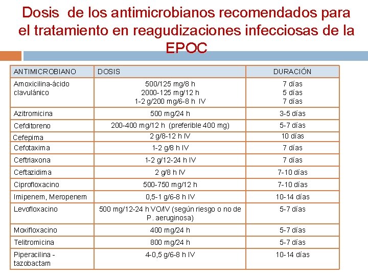 Dosis de los antimicrobianos recomendados para el tratamiento en reagudizaciones infecciosas de la EPOC ANTIMICROBIANO Amoxicilina-ácido clavulánico DOSIS DURACIÓN 500/125 mg/8 h 2000 -125 mg/12 h 1 -2 g/200 mg/6 -8 h IV 7 días 5 días 7 días Azitromicina 500 mg/24 h 3 -5 días Cefditoreno 200 -400 mg/12 h (preferible 400 mg) 5 -7 días Cefepima Cefotaxima 2 g/8 -12 h IV 10 días 1 -2 g/8 h IV 7 días Ceftriaxona 1 -2 g/12 -24 h IV 7 días Ceftazidima 2 g/8 h IV 7 -10 días 500 -750 mg/12 h 7 -10 días 0, 5 -1 g/6 -8 h IV 10 -14 días Levofloxacino 500 mg/12 -24 h VO/IV (según riesgo o no de P. aeruginosa) 5 -7 días Moxifloxacino 400 mg/24 h 5 -7 días Telitromicina 800 mg/24 h 5 -7 días Piperacilina tazobactam 4 -0, 5 g/6 -8 h IV 10 -14 días Ciprofloxacino Imipenem, Meropenem