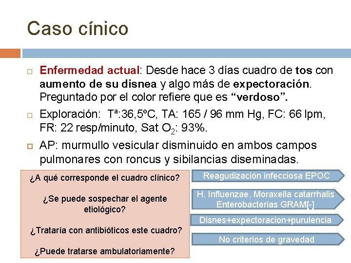 Caso cínico Enfermedad actual: Desde hace 3 días cuadro de tos con aumento de su disnea y algo más de expectoración. Preguntado por el color refiere que es “verdoso”. Exploración: Tª: 36, 5ºC, TA: 165 / 96 mm Hg, FC: 66 lpm, FR: 22 resp/minuto, Sat O 2: 93%. AP: murmullo vesicular disminuido en ambos campos pulmonares con roncus y sibilancias diseminadas. ¿A qué corresponde el cuadro clínico? ¿Se puede sospechar el agente etiológico? Reagudización infecciosa EPOC H. Influenzae, Moraxella catarrhalis Enterobacterias GRAM[-] Disnes+expectoracion+purulencia ¿Trataría con antibióticos este cuadro? ¿Puede tratarse ambulatoriamente? No criterios de gravedad
