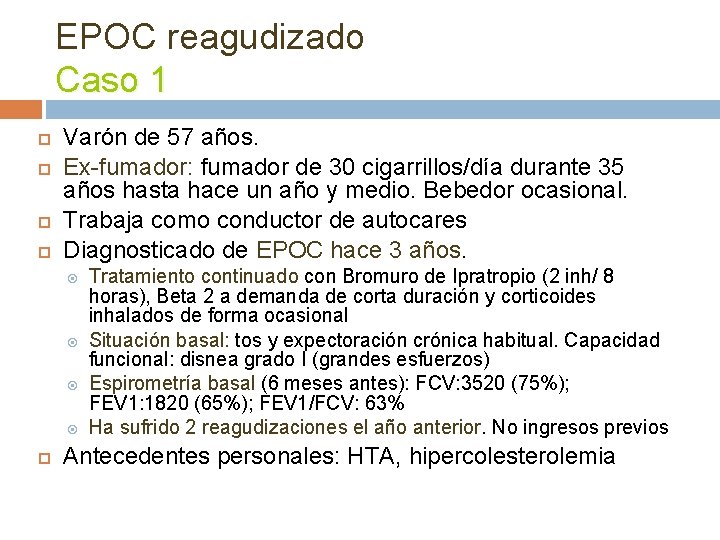 EPOC reagudizado Caso 1 Varón de 57 años. Ex-fumador: fumador de 30 cigarrillos/día durante 35 años hasta hace un año y medio. Bebedor ocasional. Trabaja como conductor de autocares Diagnosticado de EPOC hace 3 años. Tratamiento continuado con Bromuro de Ipratropio (2 inh/ 8 horas), Beta 2 a demanda de corta duración y corticoides inhalados de forma ocasional Situación basal: tos y expectoración crónica habitual. Capacidad funcional: disnea grado I (grandes esfuerzos) Espirometría basal (6 meses antes): FCV: 3520 (75%); FEV 1: 1820 (65%); FEV 1/FCV: 63% Ha sufrido 2 reagudizaciones el año anterior. No ingresos previos Antecedentes personales: HTA, hipercolesterolemia