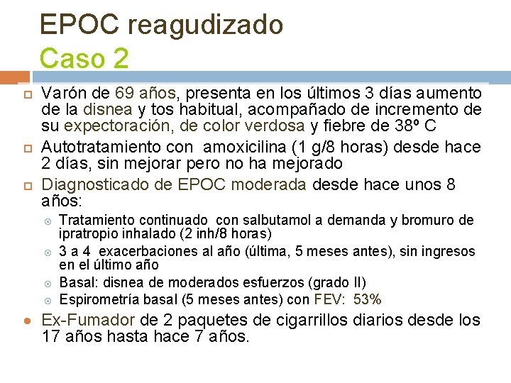 EPOC reagudizado Caso 2 Varón de 69 años, presenta en los últimos 3 días aumento de la disnea y tos habitual, acompañado de incremento de su expectoración, de color verdosa y fiebre de 38º C Autotratamiento con amoxicilina (1 g/8 horas) desde hace 2 días, sin mejorar pero no ha mejorado Diagnosticado de EPOC moderada desde hace unos 8 años: Tratamiento continuado con salbutamol a demanda y bromuro de ipratropio inhalado (2 inh/8 horas) 3 a 4 exacerbaciones al año (última, 5 meses antes), sin ingresos en el último año Basal: disnea de moderados esfuerzos (grado II) Espirometría basal (5 meses antes) con FEV: 53% Ex-Fumador de 2 paquetes de cigarrillos diarios desde los 17 años hasta hace 7 años.