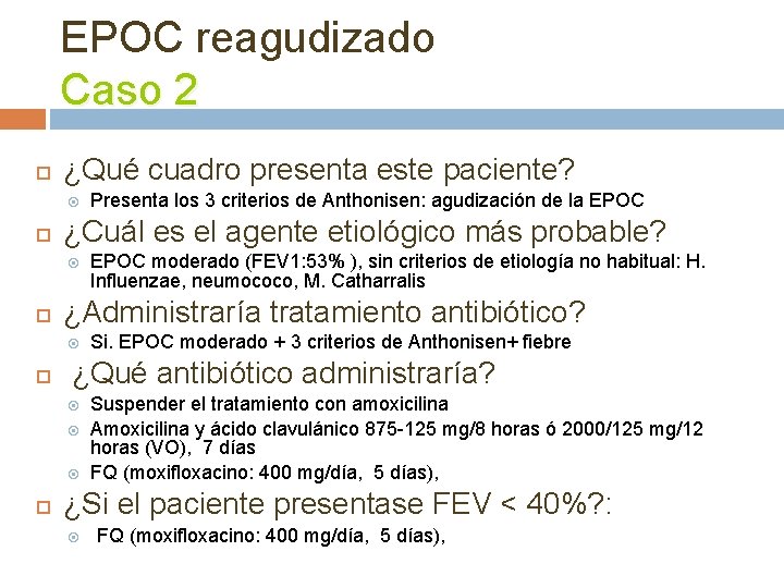 EPOC reagudizado Caso 2 ¿Qué cuadro presenta este paciente? ¿Cuál es el agente etiológico más probable? Si. EPOC moderado + 3 criterios de Anthonisen+ fiebre ¿Qué antibiótico administraría? EPOC moderado (FEV 1: 53% ), sin criterios de etiología no habitual: H. Influenzae, neumococo, M. Catharralis ¿Administraría tratamiento antibiótico? Presenta los 3 criterios de Anthonisen: agudización de la EPOC Suspender el tratamiento con amoxicilina Amoxicilina y ácido clavulánico 875 -125 mg/8 horas ó 2000/125 mg/12 horas (VO), 7 días FQ (moxifloxacino: 400 mg/día, 5 días), ¿Si el paciente presentase FEV < 40%? : FQ (moxifloxacino: 400 mg/día, 5 días),