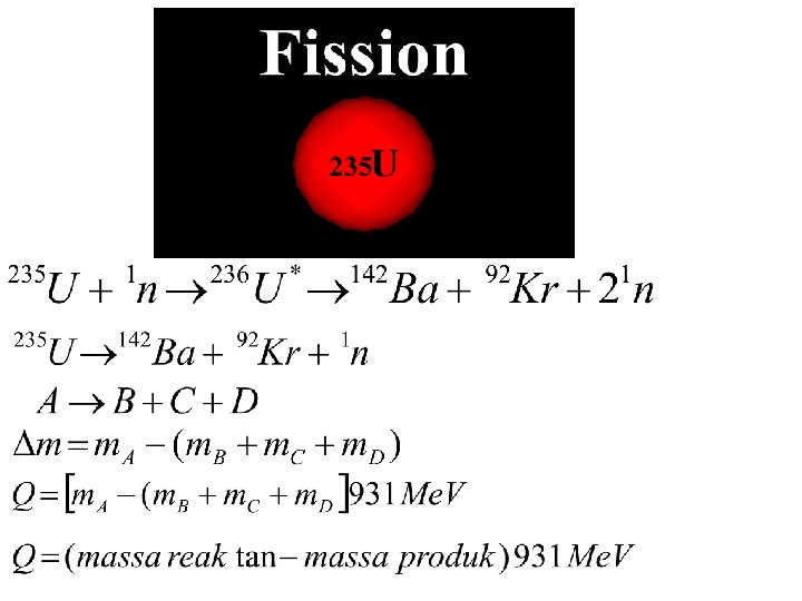 Reaksi Inti Berdasarkan Model Tetes Cairan Netron lambat diserap oleh inti U-235 memberikan energi tambahan dalam inti. Energi tambahan dalam inti menyebabkan inti berubah bentuk menjadi memanjang. Ketika inti memanjang gaya Coulomb lebih besar dari gaya ikat inti, kemudian inti membelah menjadi dua inti yang baru.